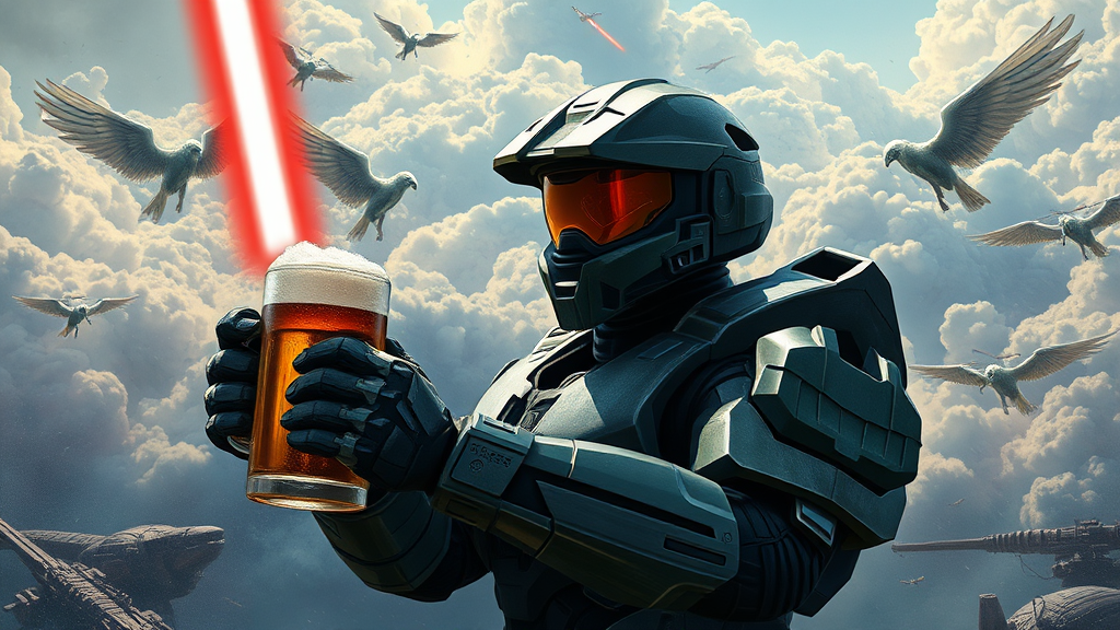 Master Chief from the game Halo clutching a frothy beer mug against the backdrop of a vast galactic war, expertly detailed illustration with beautiful hands, digital painting focusing on sharpness and intricacy, concept art in a matte style, a true masterpiece. Features include a Jedi lightsaber analysis poster, blending technical drawings and infographics, enriched with engineering sketches and handwritten notes. The artwork carries echoes of post-soviet illustration with surreal, biblical angels amidst a background of bright, dense clouds. Rendered in 4k with cinematic HDR lighting, the scene is purposefully not realistic, enhancing its unique artistic vision. Realistic shadows intertwine with UHD clarity, creating an imperfect yet visually captivating environment.