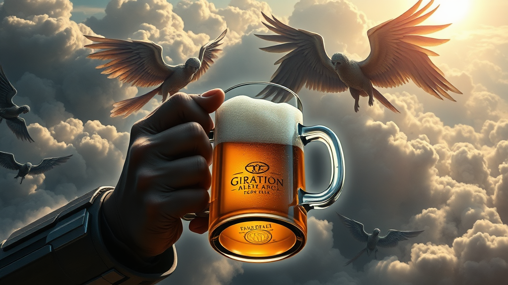 Master Chief from the game Halo holding a beer mug amidst a cosmic battle backdrop; the scene features beautiful, highly detailed hands in sharp focus with intricate details. This digital painting, serving as concept art, resembles a masterpiece with elements of Jedi lightsaber analysis in the form of a poster, featuring technical drawing, infographic, engineering schematics, and handwritten notes. The style borrows from post-soviet illustration with a surreal twist, incorporating biblical angels into the composition, set against a backdrop of sunlit dense clouds. Executed in 4K with cinematic lighting and realistic shadows, this image prioritizes extreme detail and HDR effects. The design maintains a surrealistic approach, steering clear of photorealism, and presents a dynamic visually engaging scene with a subtly altered narrative, avoiding any disfigurement or unnatural features.