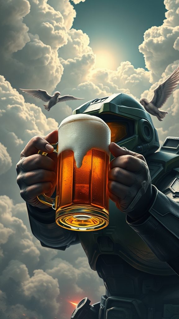 Master Chief from the game Halo holds a frothy beer mug amidst an epic galactic war backdrop. His hands are beautifully illustrated, intricate with sharp focus. The scene is a highly detailed digital painting, concept art that merges futuristic engineering illustrations with a Jedi lightsaber analysis theme. It features technical drawings and infographics, laden with handwritten notes and post-soviet stylistic influences. Surreal elements include biblical angels amidst sunny, dense clouds, rendered in 4k cinematic lighting with HDR effects. The background, infused with realistic shadows, contrasts with the bloody, surreal elements. The piece avoids realistic photography but retains the surreal intensity, focusing on creative yet precise details.