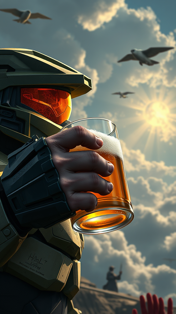 Master Chief from the game Halo is depicted holding a beer mug with a grand galactic war raging in the background. The illustration features beautiful, intricately detailed hands in sharp focus, showcasing a digital painting style that is highly detailed and reminiscent of concept art masterpieces. In the scene, there's a Jedi lightsaber analysis poster, featuring technical and engineering drawings with handwritten notes and intricate details. The piece embraces a post-soviet illustration style with surreal elements, like biblical angels, set against a backdrop of sunny, dense clouds. The art is rendered in 4k with cinematic lighting, providing extremely detailed HDR and realistic shadows. The overall aesthetic is not realistic, with a blend of UHD elements and a bloody background, carefully avoiding disfigured features and maintaining human-like hand anatomy.