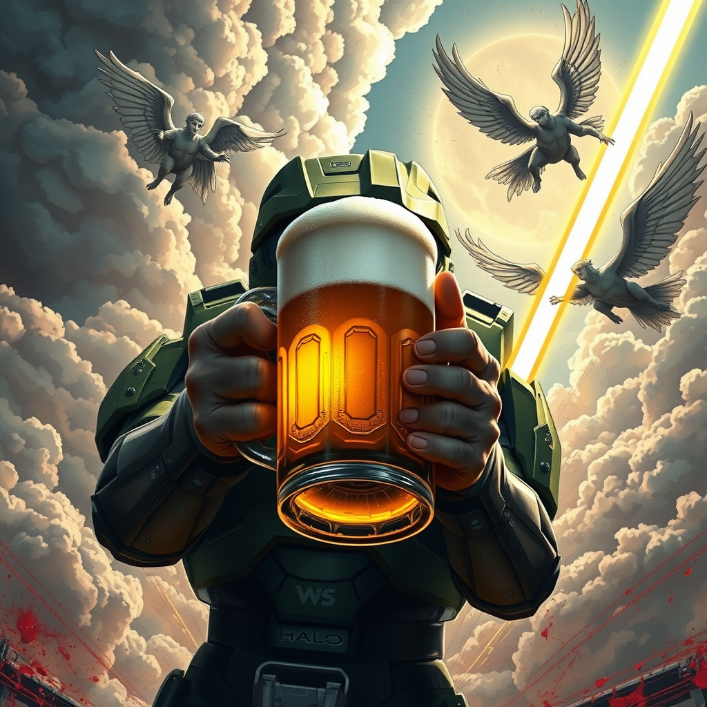 Master Chief from the game Halo proudly holding a frothy beer mug amidst a swirling galactic war backdrop, showcasing beautiful and precise hands. Illustrated in sharp focus, the scene is a highly detailed digital painting, concept art with a matte finish, achieving a masterpiece quality. The surroundings resemble a Jedi lightsaber analysis poster with technical drawings and infographics. Engineering notes scribbled in a post-soviet illustration style add depth. The backdrop is surreal, with biblical angels intertwined with sunny, dense clouds illuminated by cinematic lighting. The image is extremely detailed, rendered in 4k, with HDR effects enhancing the vividness and realistic shadows contrasting the not-so-realistic elements. The design steers away from realism, infusing a unique artistic touch, with a subtly eerie, bloody background. The hands, intricately illustrated, remain perfect with five fingers.