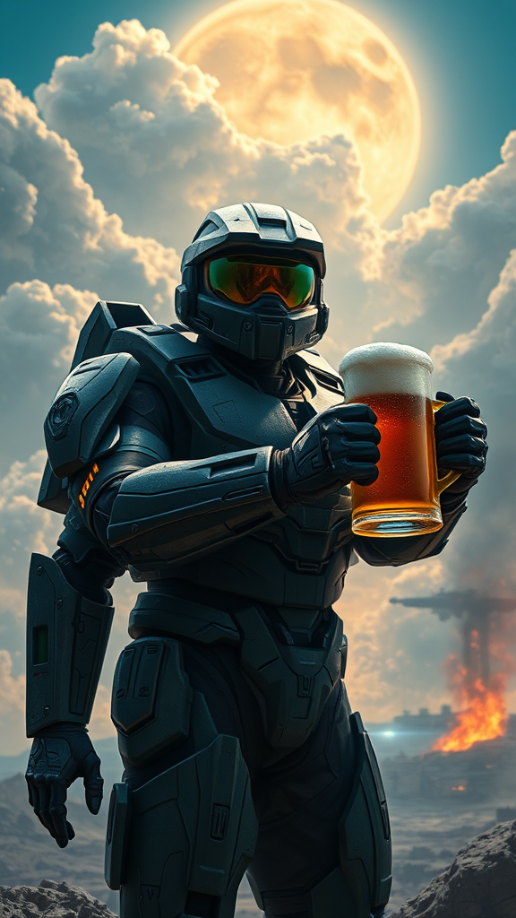 Master Chief from the game Halo stands triumphantly holding a frothy beer mug as an epic galactic war unfolds behind him. The scene is a breathtaking illustration, rendered in a sharp focus digital painting style. Capturing the essence of concept art, it features highly detailed elements reminiscent of engineering drawings and technical posters, merged with Jedi lightsaber analysis and marked by intricate handwritten notes. Set against a backdrop of intensely beautiful, sunny clouds characteristic of a post-soviet surreal illustration, mythical angels inspired by biblical descriptions emerge. The composition is framed in 4k cinematic lighting with realistic shadows, HDR quality, and an otherworldly atmosphere, maintaining a non-photorealistic allure while avoiding distorted elements like unnatural physique or excessive fingers, ensuring a visual masterpiece.