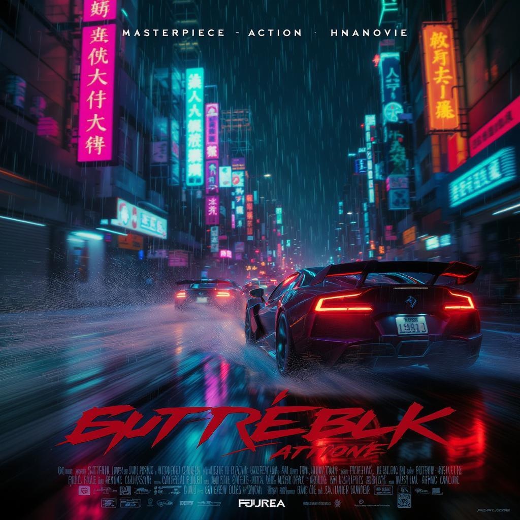 Masterpiece Action Movie poster of high-speed racing through a cyberpunk city at night, capturing the frenzy and excitement of vehicles tearing through the streets with a barely visible presence due to their incredible speed. Rain pours down, adding gloss to the neon-lit scenery, while streaking motion blur and bokeh lights emphasize the dynamic energy. The scene is captured with extreme detail and cinematic lighting, utilizing an 8k UHD HDR shot that evokes the raw, candid feel of cinema. Shot with a studio-quality 35mm camera, the image is color graded akin to Portra 400 film, offering remarkable hues. The action is photographed with a cinematic camera like the FujiFilm XT3, ensuring a visually stunning and immersive experience.