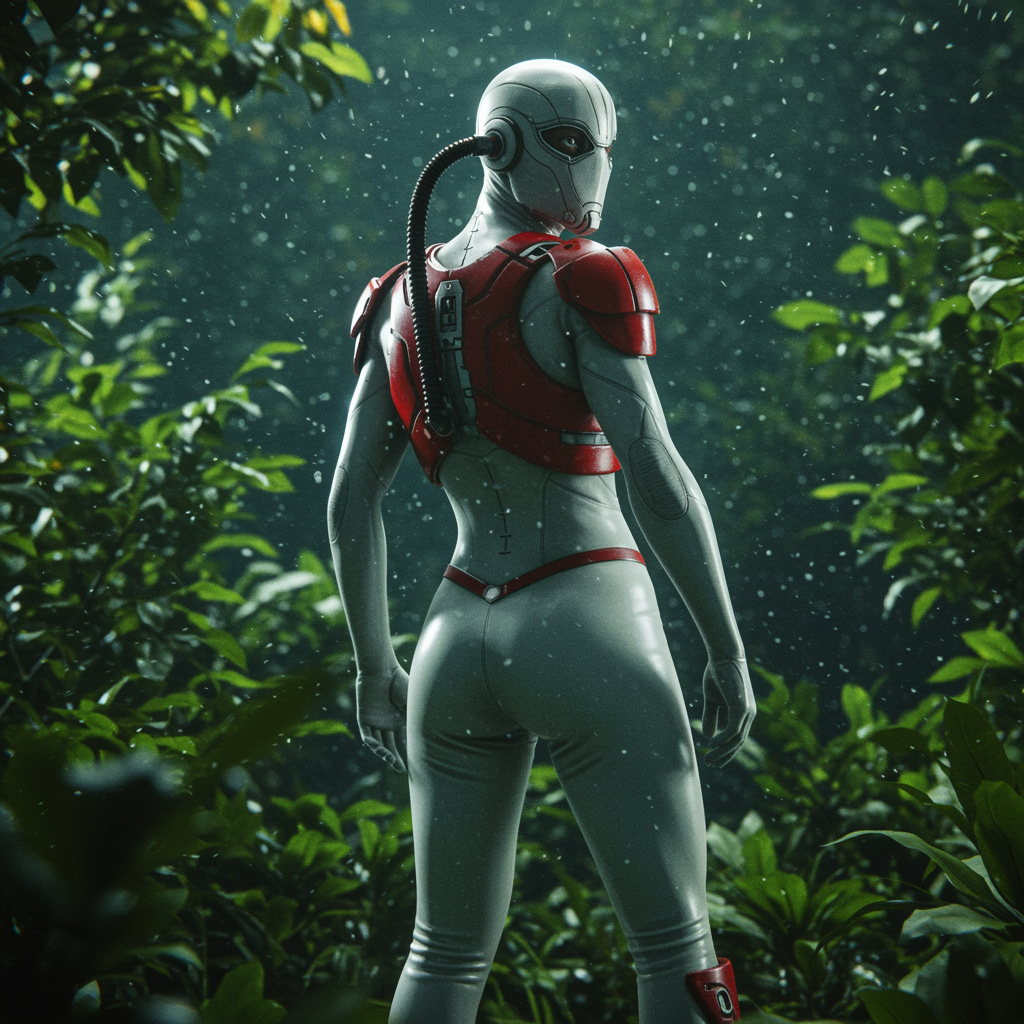 Masterpiece analog style, film-like rear angle photo of a space renegade, clad in white latex shorts with red armored vest, emphasizing their form, looking back at viewer with realistic skin texture and fine details, surrounded by lush green foliage with vivid, rich colors; particle effects create beautiful cinematic light, all captured with a shallow depth of field using a Hasselblad X1D II 50c paired with a 90mm f/2.8 cine lens, in sharp focus, reminiscent of a cinestill 800T film aesthetic, rendered in HDR, 8k resolution, evoking the feel of a cinematic film still, showcasing the protagonist from behind, with a notable presence.