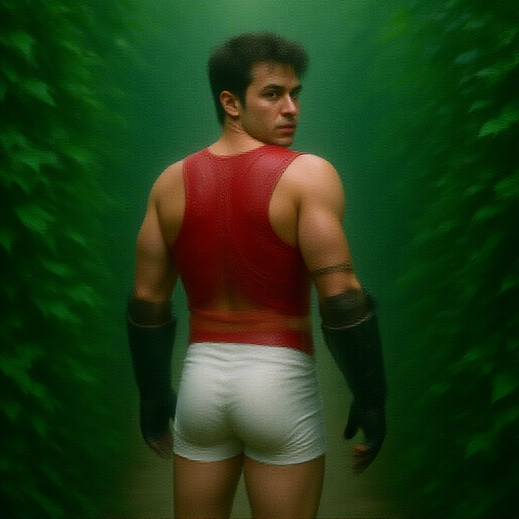 Masterpiece, analog style, reminiscent of a film still, a space outlaw in focus from the rear angle, adorned in white latex shorts and a red armored vest, the figure looking back with a realistic skin texture and attention to fine details. The scene transitions to lush green vegetation with vivid colors and intricate details, creating a vibrant backdrop. Subtle particle effects enhance the experience, with beautiful cinematic lighting and a shallow depth of field, captured using a Hasselblad X1D II 50c with a 90mm f/2.8 cine lens. The image is sharply focused and shot on Cinestill 800T, featuring HDR and presented in 8k resolution, capturing the essence of a cinematic masterpiece from behind.