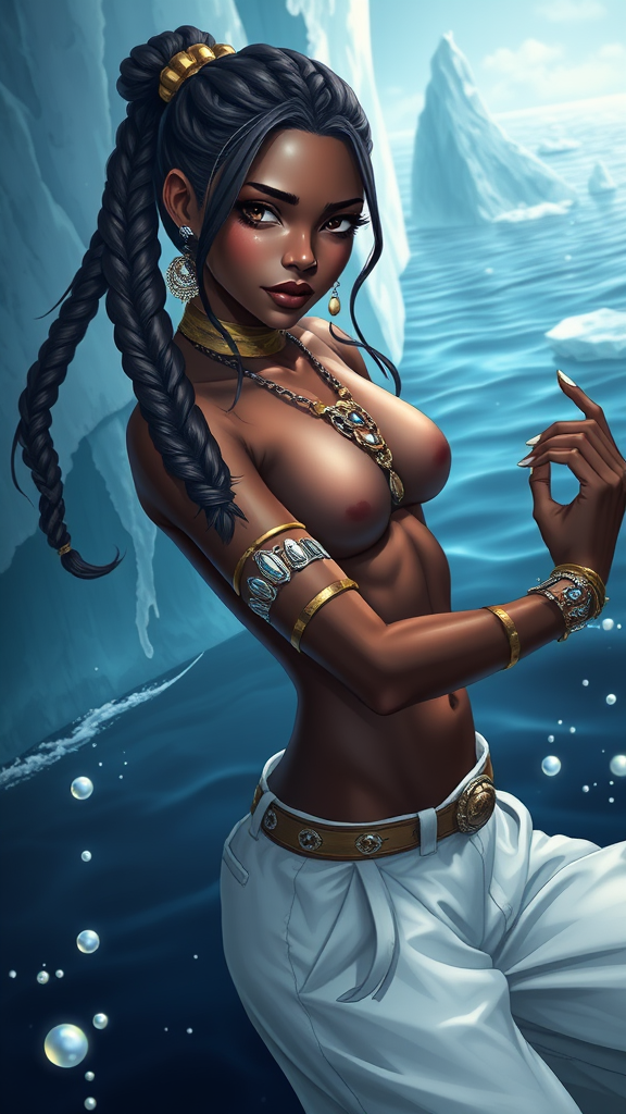 masterpiece, best quality, 1girl, katara-inspired, athletic, dark skin, intricate braid, embellishments, wrapped forearms, elegant jewelry, direct gaze, upper body focus, iceberg backdrop, oceanic setting, arctic atmosphere, highly detailed, bare-chested, flowing white pants, relaxed fit trousers, flowing water, water manipulation, floating droplets