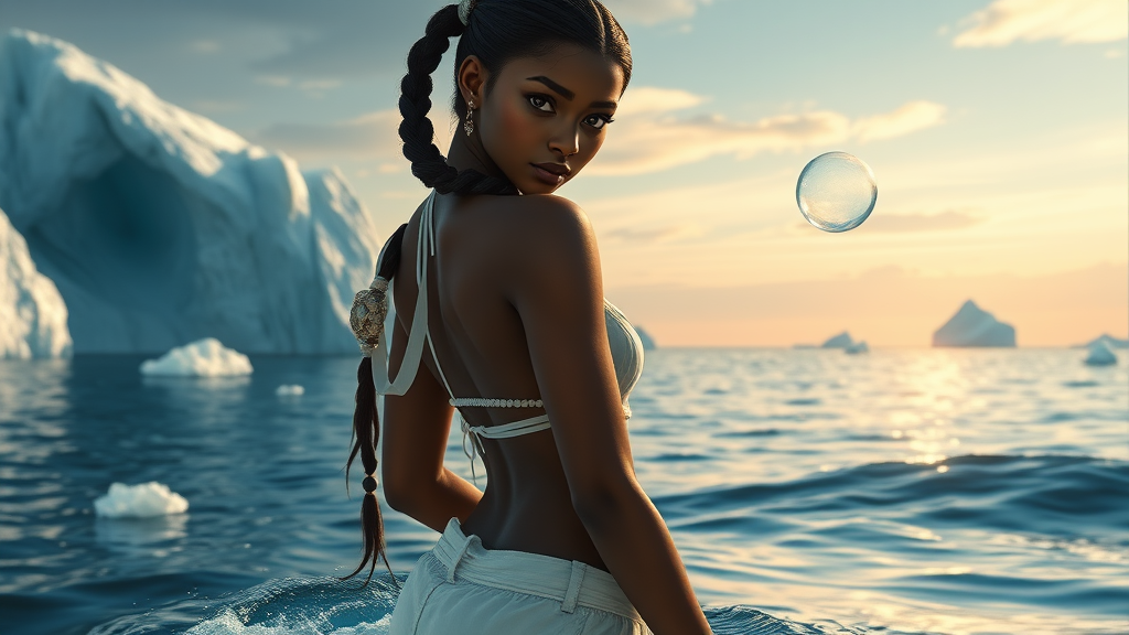 Masterpiece best quality 1girl Katara toned dark skin braid bandages jewelry looking at viewer upper body iceberg background ocean arctic detailed white pants loose pants water waterbending bubble elegant artistic expression dynamic pose gentle waves shimmering accents vibrant atmosphere crisp icy scenery enchanting aura creative interpretation natural beauty timeless grace cinematic perspective.