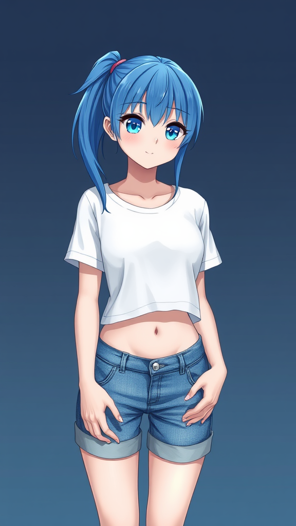 masterpiece, best quality, 1girl, solo, blue hair, ponytail, bright eyes, white and blue theme, comfortable white T-shirt, denim shorts, medium build, visible navel, standing, mid-shot, ultra HD, sharp details, vibrant colors, unique expression, natural pose, artistic style, clean lines, focus on character, absence of digital flaws, coherent composition, harmonious elements, clear features, realistic proportions