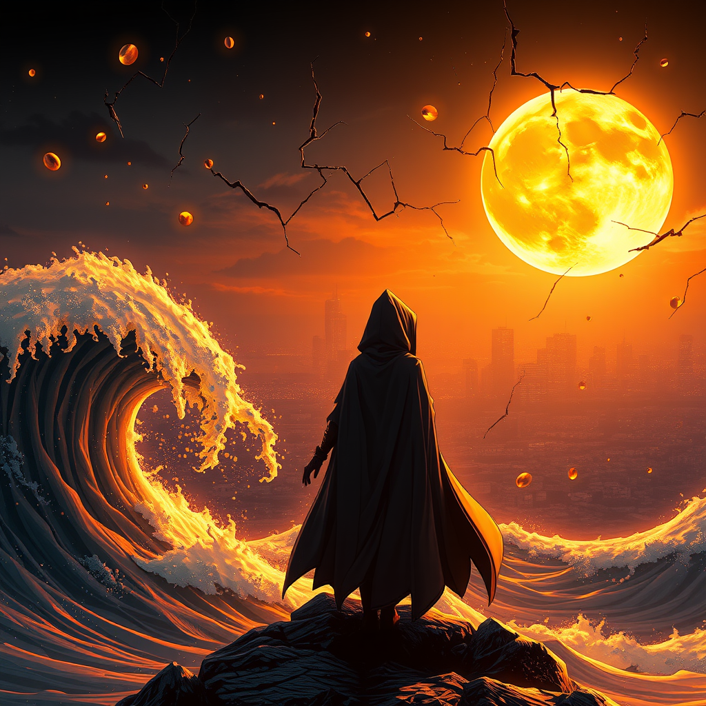 Masterpiece, best quality, a golden ocean wave, vibrant orange sunset illuminating the water, golden droplets suspended in the air, a lone female figure standing on an outcrop gazing at a sprawling cityscape by night, stylized urban fantasy art, a hooded Sith Lord, digital cyberpunk anime art, ominous blood moon backdrop, enveloped in a futuristic science fiction cape, digital cyberpunk - anime art, contemporary science fiction anime, dark cyberpunk illustration, cyberpunk anime girl with a hood amidst a blood moon event, depicted with Unreal Engine rendering, fractured sky, turbulent winds, sky peering through cracks, ultra-realistic material details, extreme intricacy, hyper-realistic substances, conceptual art in Unreal Engine, ruptured sky, Unreal Engine art, majestic lighting, concept art brought to life in Unreal 5, Unreal Engine Art 5.
