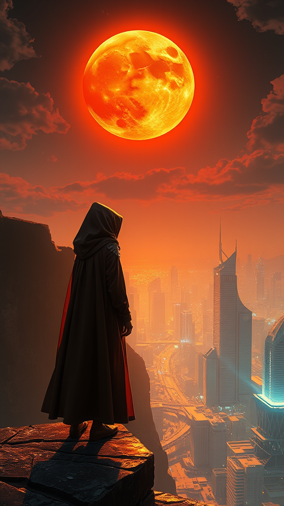 Masterpiece, best quality, a golden sea wave under a vivid orange sunset with light streaming through, golden droplets in the air, a lone girl standing on a ledge overlooking a bustling cityscape at night. It's an urban fantasy setting with stylized digital cyberpunk anime art. The girl, a mysterious hooded figure resembling a Sith Lord, wears a futuristic science fiction cloak. Above her, a striking blood moon casts an eerie glow on the scene. The environment embodies modern science fiction aesthetics with dark cyberpunk elements, capturing the essence of an anime cyberpunk world. The sky appears torn and fractured, revealing a surreal landscape with peeled layers and cracks. This hyper-detailed setting is rendered with extreme realism and dramatic lighting, using Unreal Engine 5 to bring forth a visually stunning concept art masterpiece.