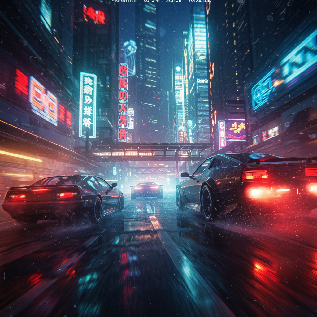 Masterpiece, Best Quality Action Movie poster featuring a high-speed race through a futuristic cyberpunk cityscape at night, with vehicles moving at such breathtaking speeds they are barely discernible, captured in a dramatic rain-soaked setting. The scene is enhanced with streaking motion blur and dynamic bokeh, highlighting the action with extreme detail and cinematic lighting. The auto racing action shot is presented in stunning 8k resolution, UHD, HDR, and RAW format, embodying the essence of candid cinema with the sophistication of a studio shoot. Emulating the timeless look of 35mm film and color graded to reflect the rich tones of Portra 400, the image bursts with remarkable color. Captured with the clarity and depth of a FujiFilm XT3, the poster remains untouched by intrusive elements like logos, watermarks, or poorly rendered art. The image focuses on the visceral thrill of high-speed racing, eschewing distractions such as text, 3D effects, or video game references, for a pure, immersive experience.