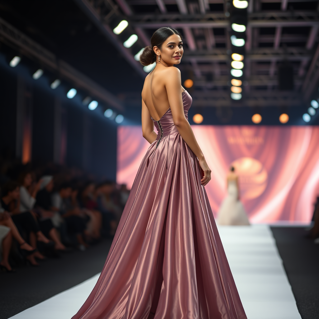 Masterpiece best quality gorgeous female model elegantly poised at the end of a runway fashion show bustling in the background wearing a stunning and sophisticated full-length gown with sharp focus highly detailed 4k uhd cinematic lighting impeccable ambiance and flawless execution.