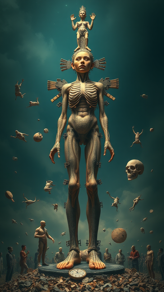 Masterpiece, best quality, incredible detail, highly detailed composition, ultra-detailed, dynamic light play, trending on art platforms, sharp focus, surreal absurdity, human totem pole, abstract anatomy, distorted forms, extra appendages, missing elements, floating pieces, disconnected parts, intriguing mutations, unconventional beauty, deliberately unsettling, dream-like blur, artistic amputation, imaginative distortion.