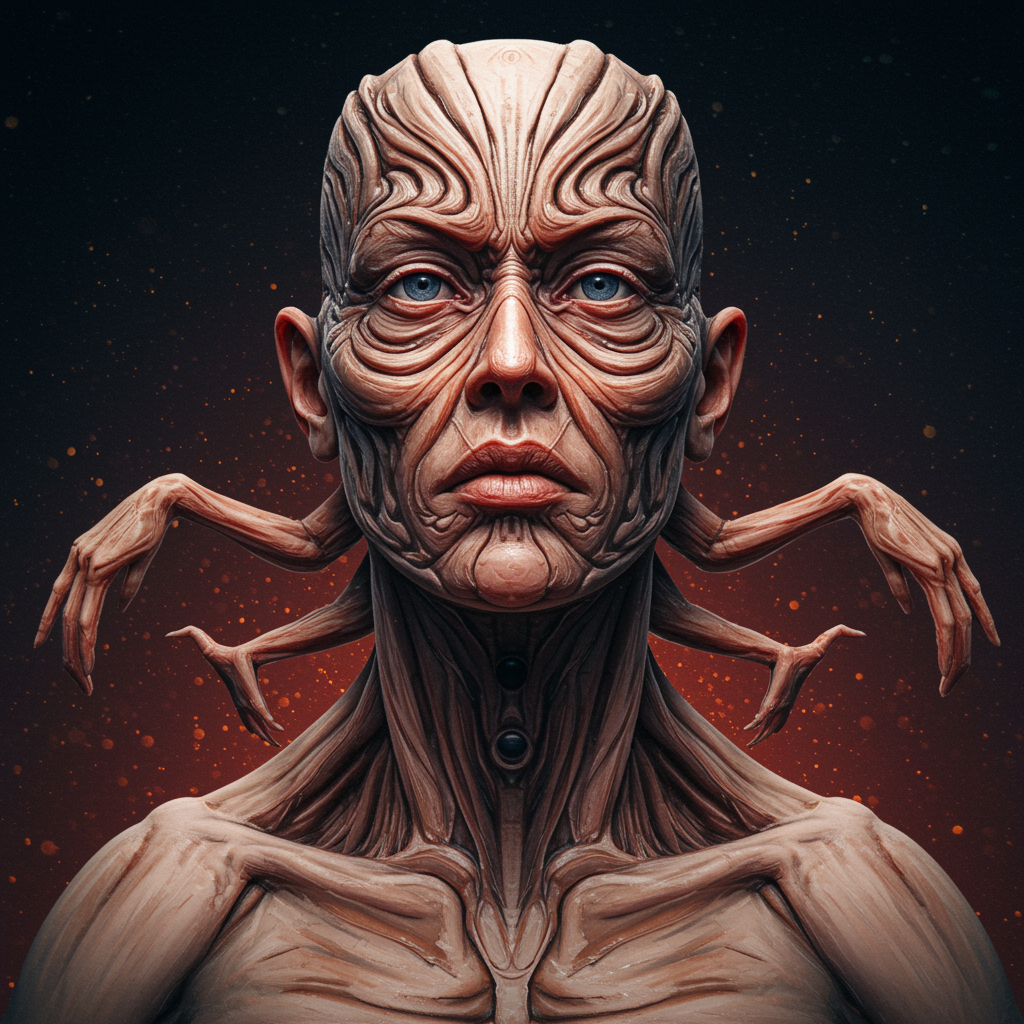 Masterpiece, best quality, portrait, vivid detail, intricate composition, ultra-detailed features, light effects, trending on art platforms, sharp focus, high-resolution, surreal form, totem structure, distorted anatomy, anatomical irregularities, extra limbs, absent limbs, detached limbs, limb levitation, disconnected extremities, genetic mutations, grotesque appearance, unsettling distortion, soft blur, fragmented structure, art correction, enhanced artistry.