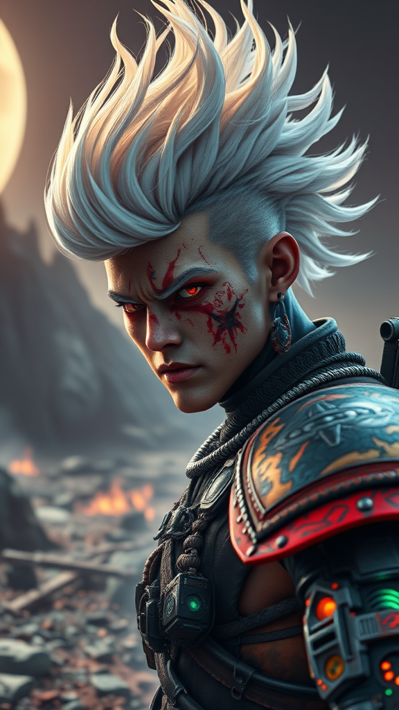 Masterpiece, best quality, realistic, colorful cinematic lighting, photo of a fire warrior with striking white hair styled upward, captivating eyes, Shas Warrior from Warhammer 40k, fan art, vivid details, vibrant colors, set against the landscape of an alien planet with a detailed background. The warrior is in a dynamic pose with an intense expression, complex sci-fi theme, captured with a 50mm prime lens at F/2.8 aperture, hyper-realistic and lifelike texture, photorealistic in 8k resolution, sharp focus, utilizing Unreal Engine and ENB with Cinestill 800. Emphasizing a seamless and cohesive anatomy while avoiding elements of disconnection or mutation that detract from the aesthetic.