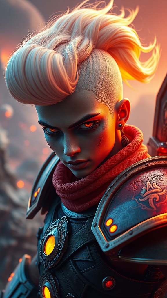 Masterpiece, best quality, realistic, colorful cinematic lighting, photo of a fire warrior with striking white updo hair, captivating eyes, Shas Warrior from Warhammer 40k, fanart with vivid details and vibrant colors. The background showcases a detailed landscape of an alien planet, depicting a dynamic pose with an aggressive expression. The scene is complex and rendered with RTX technology, capturing both sci-fi elements and a 50mm prime lens, F/2.8 aperture for hyper-realistic, lifelike texture and photorealistic clarity in 8k resolution. Focus is sharp, achieved through unreal engine and ENB, cinestill 800 film look, resulting in a visually stunning image without the presence of awkward anatomical features, ensuring seamless design and aesthetic appeal.