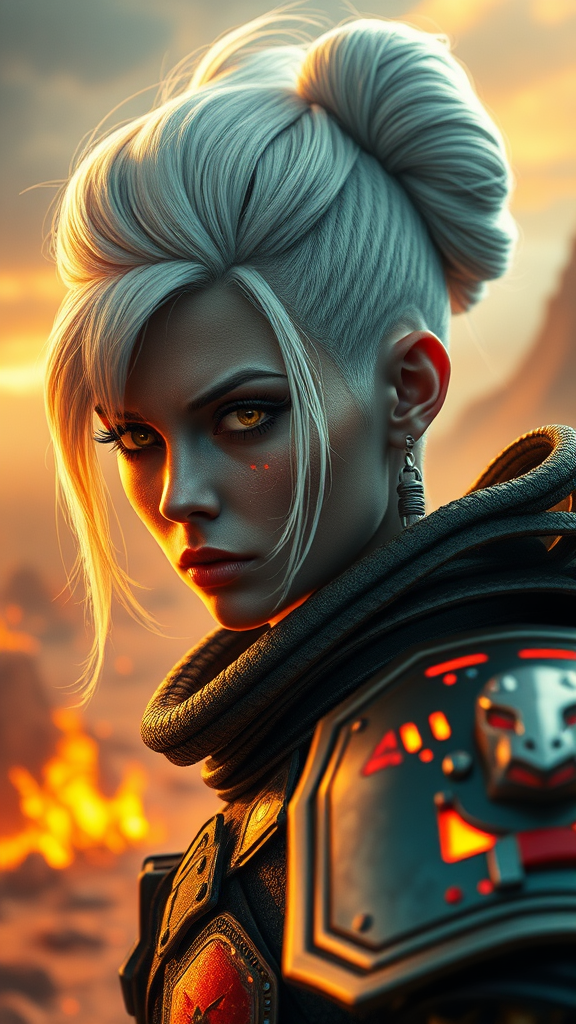 Masterpiece best quality realistic colorful cinematic lighting photo of a fire warrior with updo white hair pretty eyes Shas Warrior Warhammer 40k fanart vivid details vibrant colors background is landscape of an alien planet detailed background dynamic pose aggressive look complex RTX sci-fi 50mm prime lens F/2.8 aperture hyper realistic lifelike texture photorealistic 8k sharp focus unreal engine ENB cinestill 800 with improved anatomy and balanced composition creating a visually stunning and cohesive image capturing a sense of drama and intensity.