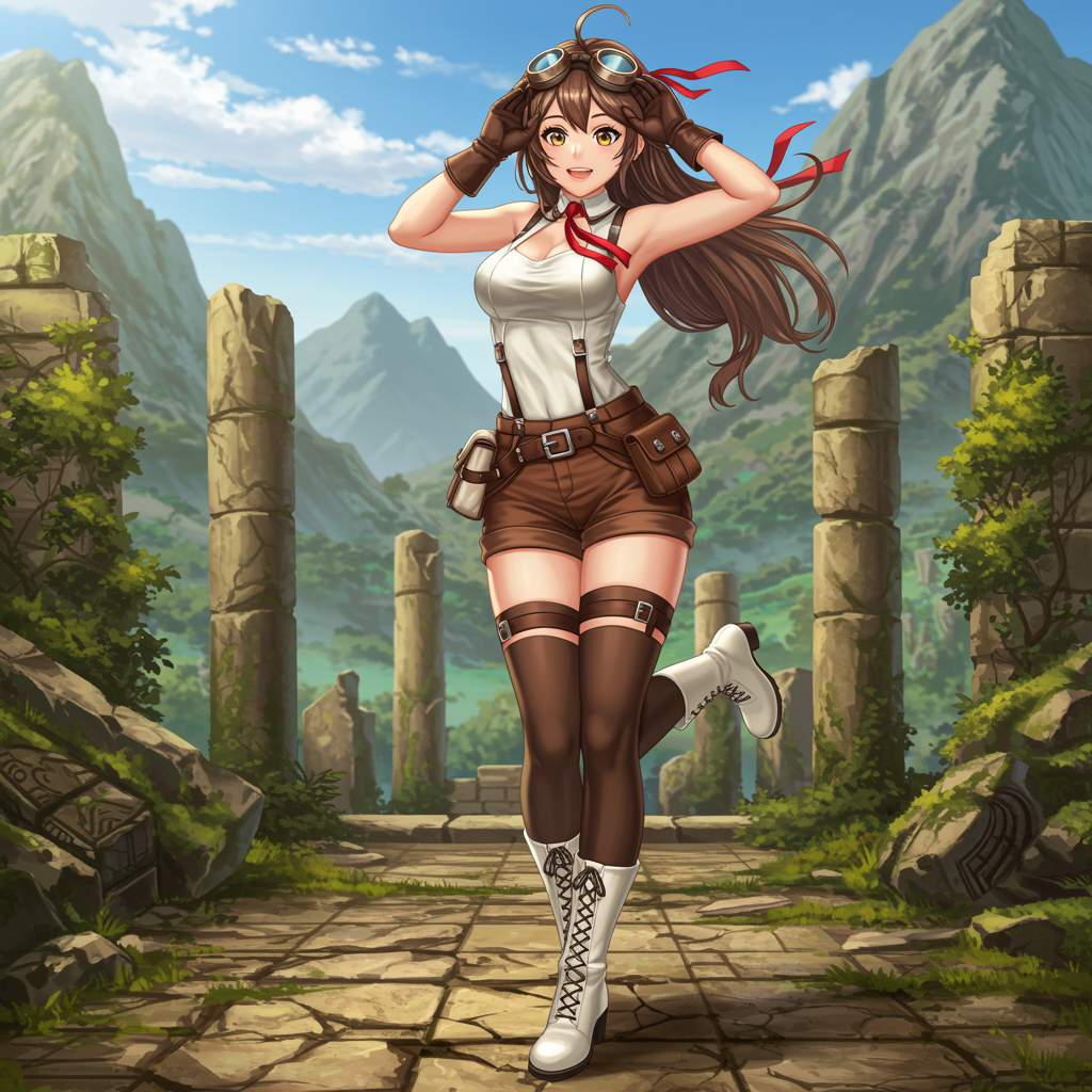 Masterpiece, best quality, soft lighting, high resolution, engaging with viewer, solo, charming expression, goggles atop head, amber eyes, brown hair, long flowing locks, adorned with red ribbon, brown shorts, leather gloves, utility pouch, thigh-high stockings, pristine white boots, medium build, tastefully accentuated attire, stylish shrug, dynamic pose, standing gracefully on one leg, surrounded by lush, overgrown ruins, majestic mountains in backdrop, 8k clarity, vivid colors, ensuring focus on central figure, avoiding replication or distortion, maintaining sharp detail, free of artifacts and distractions, clear and cohesive composition.