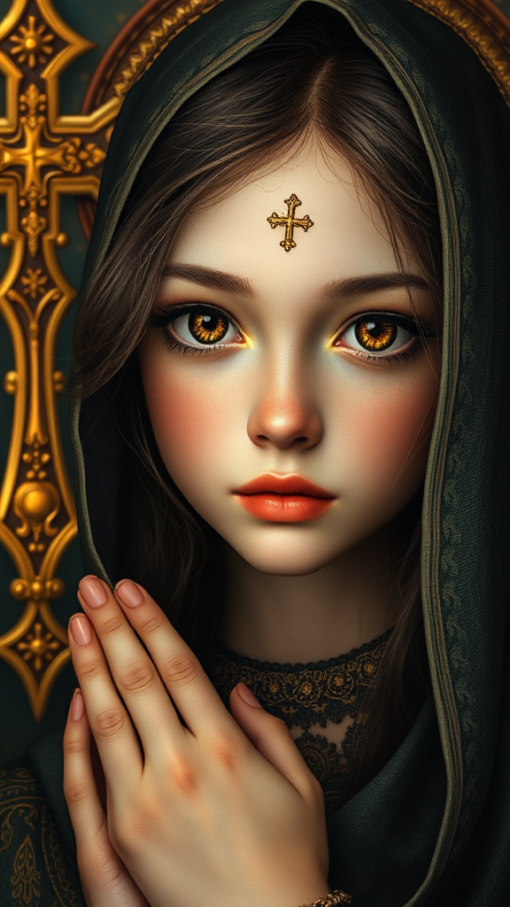 Masterpiece, best quality, super detailed face and eyes with intricate clothing, a single girl with symbol-shaped golden eyes, a shiny golden holy cross in the background, side lighting reminiscent of Alphonse Mucha's style, UHD, HDR, 8K resolution, flawlessly crafted without any duplicates or distortions, a perfectly harmonious and realistic portrayal featuring well-proportioned features and clear expressive eyes, a natural neck, with hands gracefully posed, in frame with sharp clarity and no visible artifacts or distractions, ensuring a seamless and captivating visual experience.