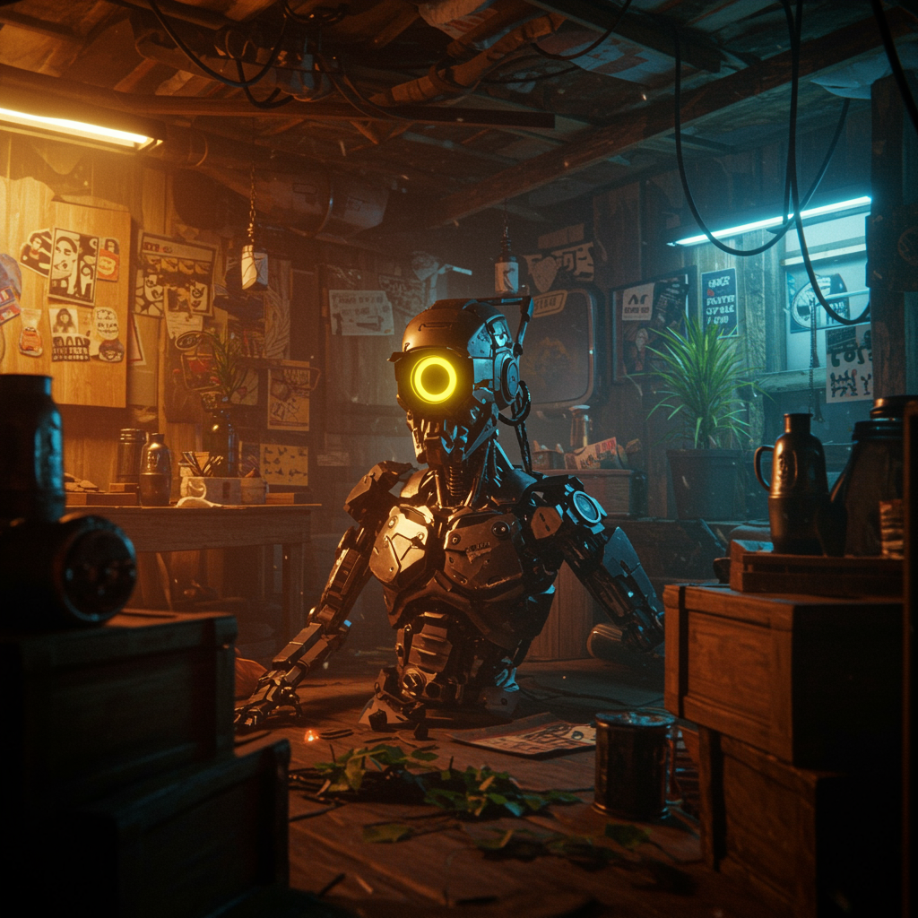 Masterpiece, best quality, ultra high res, wide angle environmental depiction of a cluttered and chaotic shack, dynamic scene, League of Legends, intense and vibrant, photo-realistic, authentic, dramatic and dark, crisp focus, 8k resolution. A robotic figure shattered into pieces with a glowing yellow visor, envisioned as a sci-fi cyberpunk gangster. Medium shot showcasing intricate design, powered by Unreal Engine, with cozy indoor lighting. Inspired by ArtStation aesthetics, detailed in the style of James Gurney and Katsuhiro Otomo. Featuring cinematic lighting, lush and vibrant natural elements, echoing the essence of Craig Mullins and Greg Rutkowski. Enhanced by volumetric light, trending on ArtStation, utilizing Octane rendering, delivering razor-sharp focus, studio photo quality with intricate details, embodying the essence of Cyber 2077.