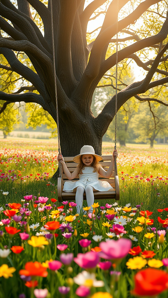Masterpiece, best quality, young girl enjoying a swing under a majestic tree, surrounded by a meadow of vibrant, colorful spring flowers. High-quality image with soft, atmospheric lighting. The scene captures a sense of joy and tranquility, with careful attention to detail and anatomy.