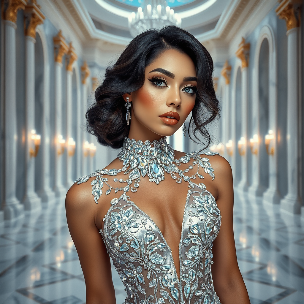 Masterpiece, captivating full body portrait of a stunning lady adorned in a shimmering Swarovski crystal ensemble, exuding sultry elegance, set within a grand white marble hall. Inspired by Swarovski's style, the image showcases intricate detailing and cinematic hyperrealism with photorealistic qualities. Vivid colors and volumetric lighting highlight the scene, influenced by the artistic visions of Joyce Ballantyne Brand, David Klein, and Roberto Cavalli. The composition is refined by techniques reminiscent of Saul Bass and retouched by Pratik Naik. Captured with a Sony Alpha 1 using an 85mm lens, f/1.4 aperture, 1/500 shutter speed, and ISO 100 film, this image boasts UHD, HDH, HDR resolution with options of 8k, 16k, and 32k. The style is expressive, with an aspect ratio of 9:16, incorporating elements of modern anime aesthetics and Niji flair.