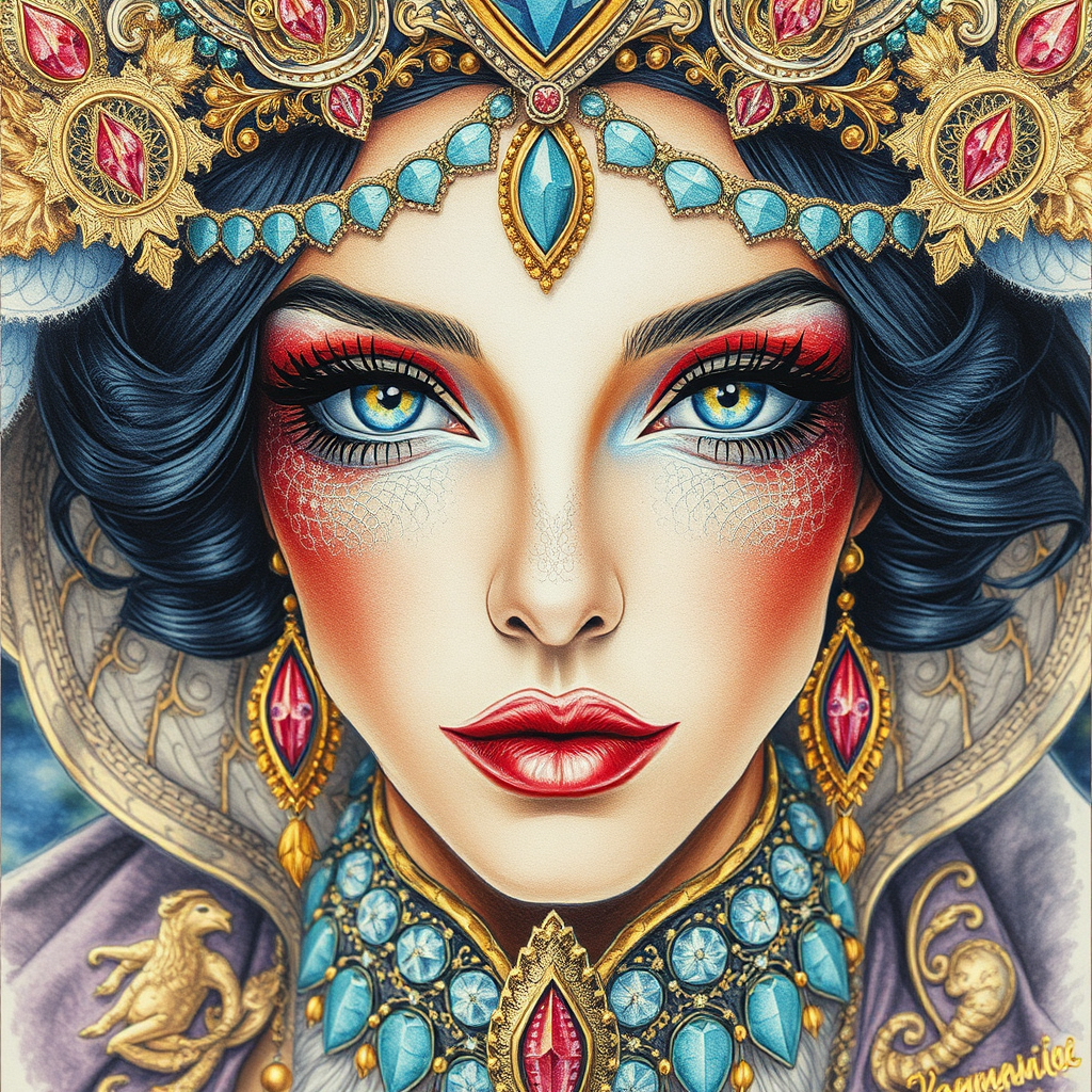 Masterpiece close-up illustration of her highness the Intergalactic princess Iikhy the radiant, unparalleled beauty, ethereal and elaborately adorned, cinematic lighting, concept art, fusion of art techniques, watercolor pencil, graphite pencil, gold leaf accents, ultra fine lines, hyper-realism, extreme detail, pentimento, abstract deconstructivism, harmonious composition, high definition, elegant framing, --ar 1:2 --c 40 --s 600