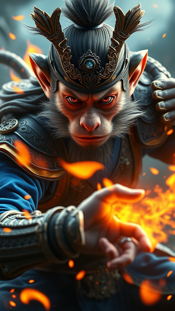 View this AI-generated image featuring masterpiece concept art mid shot in dynamic pose sun wukong at the center embodying the majestic monkey king in solo male focus fiery effects surround him highlighting detailed eyes and a face shaded with intensity clad in intricate chinese armor with a strikin