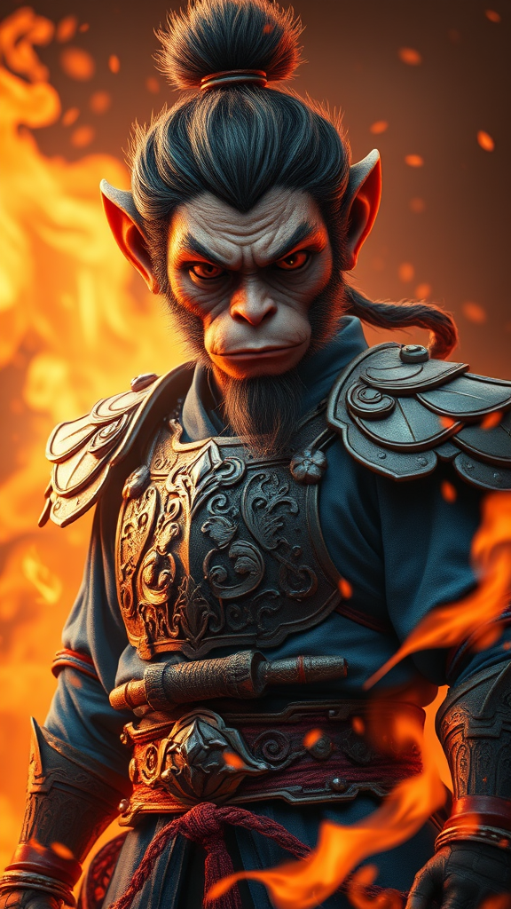 Masterpiece concept art featuring a mid shot of the legendary Sun Wukong, the Monkey King, in a dynamic pose. He stands majestically centered, with an intense focus on his male form. The scene showcases a fiery effect surrounding him, illuminating his intricately detailed eyes and a face partially shaded, adding a sense of mystery and depth. He is adorned in traditional Chinese armor with a chestplate and robust pauldrons, all under blue garments that contrast beautifully against the warm fiery colors. Rendered in Unreal Engine in stunning 8k resolution, the image captures super detail with an exceptional depth of field, enhanced by professional studio lighting, embodying the essence of award-winning splash art.