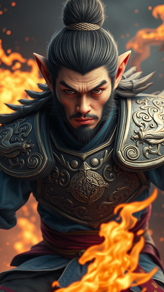Masterpiece concept art featuring Sun Wukong, the Monkey King, in a dynamic mid shot, showcasing a majestic solo male figure. Centered in the composition, he exudes power with a fiery effect surrounding him. His eyes are intricately detailed and his face is skillfully shaded, conveying depth and emotion. Clad in traditional Chinese armor with elaborately designed chest plates and blue garments, his ensemble includes striking pauldrons. Created using Unreal Engine to achieve an 8k super detail, this artwork uses expert depth of field and studio lighting to enhance the visual narrative. The scene, reminiscent of award-winning pieces, captures the essence of mythic grandeur with a subtle creative twist.
