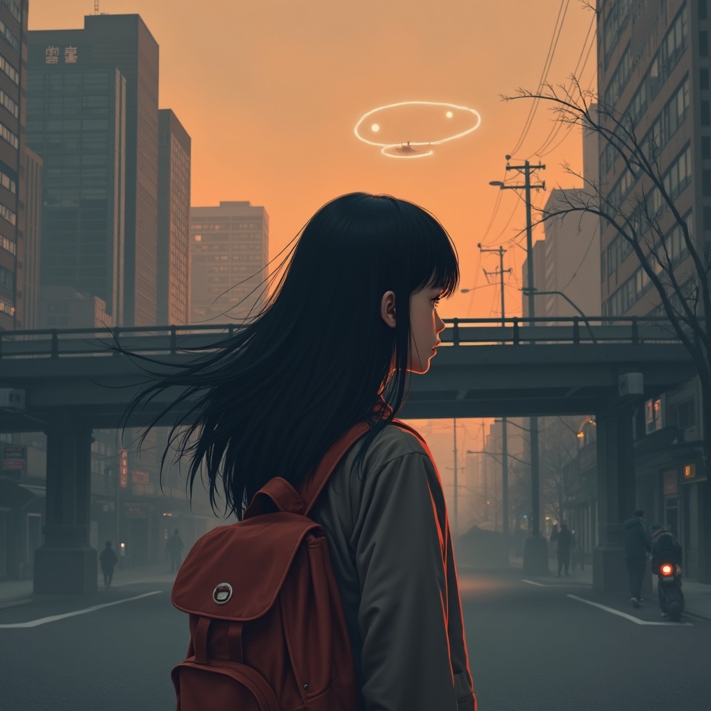 View this AI-generated image featuring masterpiece exceptional quality flat color restricted palette subtle contrast solitary girl flowing straight black hair halo effect backpack gazing into the distance upright posture mist twilight sky urban landscape dusk tall buildings overpass directional sign