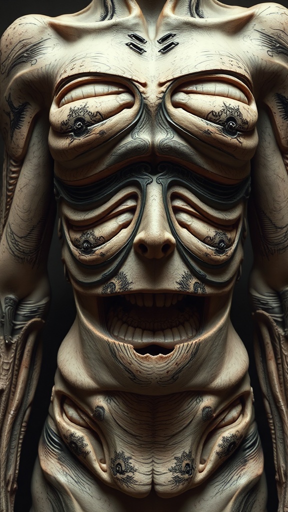 Masterpiece, exceptional quality, incredible precision, exquisitely detailed composition, ultra-detailed with light leaks, sharp focus as seen on trending platforms, Absurdres, layered torsos like a totem pole, unconventional anatomy, distorted structure, perplexing limbs, absent limbs, detached limbs, remarkable mutations, peculiar and unsettling, abstract and blurred, elements of transformation and disfigurement, unconventional aesthetics, intriguing distortions.
