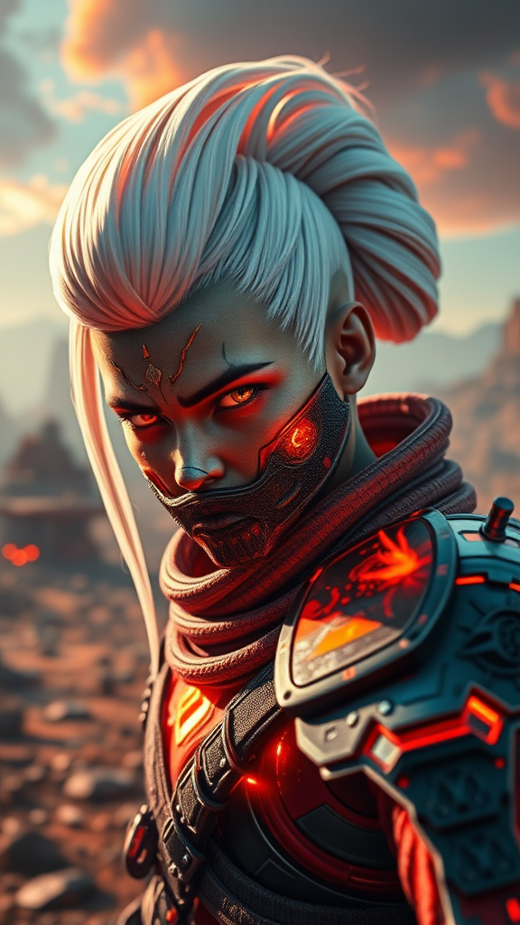 Masterpiece, exceptional quality, lifelike realism, vibrant cinematic lighting, photograph of a fire warrior with sleek white updo hair, captivating eyes, inspired Shas Warrior from Warhammer 40k, fanart with vivid details and lively colors, set against a landscape of an alien planet with a detailed backdrop, dynamic and aggressive pose, intricate design, utilizing RTX technology, sci-fi essence captured through a 50mm prime lens at F/2.8 aperture, hyper-realistic lifelike texture with photorealistic quality, rendered in 8k resolution with sharp focus, created using Unreal Engine enhanced by ENB, with a Cinestill 800 film aesthetic, excludes elements like stacked torsos, totem pole appearance, incorrect anatomy, extra or missing limbs, disconnected limbs, mutations, and maintains a clear and pleasing composition.