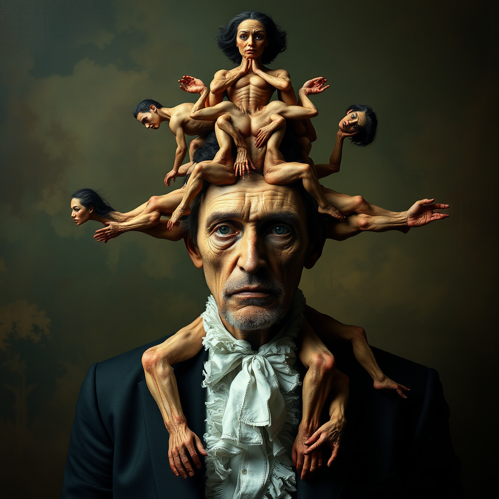 Masterpiece, exceptional quality, portrait, extraordinary detail, highly detailed composition, ultra-detailed focus, intriguing light leaks, artstation trending, sharp focus, Absurdres quality, layered figures, totem pole arrangement, distorted anatomy, puzzling proportions, additional or missing limbs, surreal floating appendages, disjointed limbs, surreal mutation, bizarre and intriguing, blurry edges, abstract amputation, dreamlike fix, art enhancer.