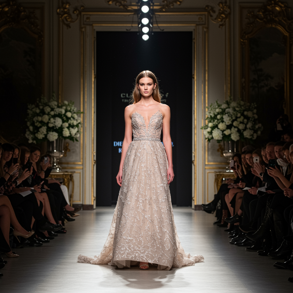 View this AI-generated image featuring masterpiece of a gorgeous female model standing confidently at the end of a runway amidst an exquisite fashion show backdrop showcasing a breathtaking and sophisticated full length gown the scene is in sharp focus with highly detailed textures captured in 4k uh