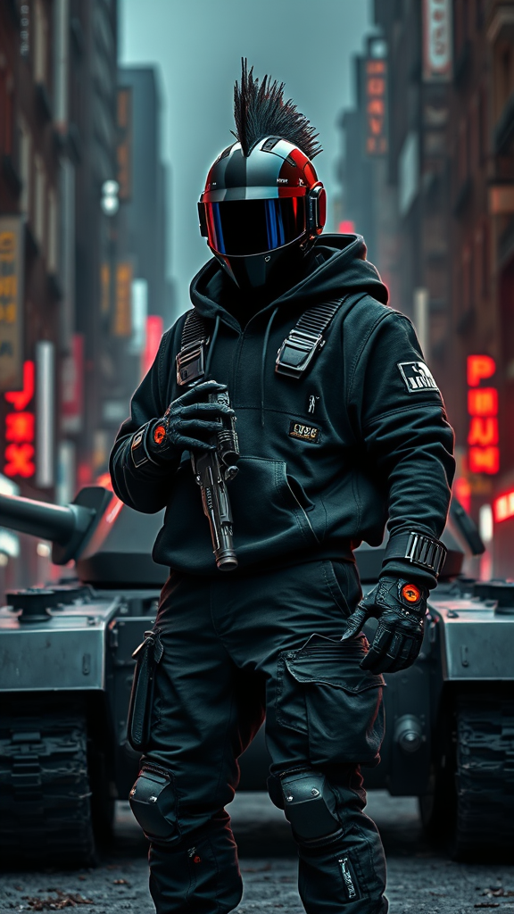 Masterpiece full-body shot, detailed raw photography, cyberpunk, ultra-realistic 3D rendering, top-tier quality, ultra-high-resolution, cowboy-themed photo, photorealistic, official art, intricate background, surreal, atmospheric, ominous, tank, dynamic perspective, advanced cyber helmet, mecha, robotic armor, mechanical limbs, exoskeleton, sci-fi, absence of humans, asymmetrical attire. Tactical oversized black hoodie, advanced black helmet, with HUD, modern hyper-realistic aesthetic, Daft Punk-inspired cyber helmet, black tactical gloves, black techwear cargo pants, futuristic garments, mohawk style, punk, rebel, punk-rock, cinematic, sci-fi environment, synthwave, nocturnal, dark tones, intricate, futuristic, sharp precision, aggressive stance, high-tech weaponry, vibrant hues, intense, cyberpunk metropolis, street neon glows, Instagram-worthy photo, Photo of the Year, cinema4d, dramatic light and shadows, realistic visual effects, Octane render of the utmost quality, photorealistic image.