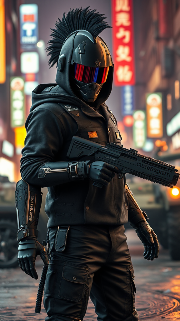 Masterpiece full-body shot, intricate raw photography, cyberpunk, realistic, highly detailed 3D rendering, top quality masterpiece ultra-high-resolution. Cowboy-themed photo, photorealistic raw photo, official art, close-up complex background, surreal atmospheric sinister tank dynamic angle, advanced cyber helmet, mecha robot armor, mechanical arms exo-suit, science fiction no humans, worn asymmetric clothing. Tactical oversized black hoodie, advanced black helmet, HUD, modern ultra-realistic style, Daft Punk-inspired cyber helmet, black tactical gloves, black techwear cargo pants, futuristic clothing, mohawk punk rebel punk-rock, cinematic sci-fi scene, synthwave night dark intricate futuristic sharp precise focus, aggressive pose high-tech weapons, vibrant colors serious cyberpunk city street neon lights, Insta-worthy photo Photo of the Year, cinema4d dramatic lights and shadows, realistic visual effects realistic Octane render highest-quality photorealistic image.