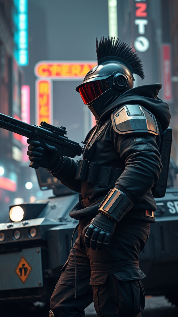Masterpiece full-body shot intricate raw photography cyberpunk realistic highly detailed 3D rendering top quality ultra-high-resolution cowboy-themed photo photorealistic raw photo official art close-up complex background surreal atmospheric sinister tank dynamic angle advanced cyber helmet mecha robot armor mechanical arms exo-suit science fiction no humans worn asymmetric clothing tactical oversized black hoodie advanced black helmet HUD modern ultra-realistic style Daft Punk-inspired cyber helmet black tactical gloves techwear cargo pants futuristic clothing mohawk punk rebel punk-rock cinematic sci-fi scene synthwave night dark intricate futuristic sharp precise focus aggressive stance high-tech weaponry vibrant colors serious cyberpunk city street neon lights Insta-worthy photo Photo of the Year cinema4d dramatic lights and shadows realistic visual effects realistic Octane render highest-quality photorealistic image introduce subtle abstract elements to enhance storytelling while maintaining the essence of the original prompt.