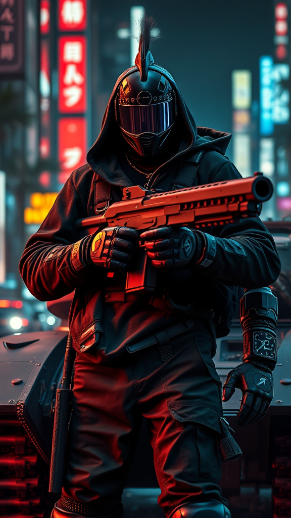 Masterpiece full-body shot, intricate raw photography. Cyberpunk, ultra-realistic, highly detailed 3D rendering, top quality, masterpiece, ultra-high-resolution. Cowboy-inspired photo, photorealistic, vivid, official art, close-up, complex background, surreal, atmospheric, ominous, tank, dynamic angle, advanced cyber helmet, mecha, robot, armor, mechanical arms, exo-suit, science fiction, devoid of humans, worn asymmetric attire. Tactical oversized black hoodie, cutting-edge black helmet with HUD, modern ultra-realistic style, Daft Punk-esque cyber helmet, sleek black tactical gloves, black techwear cargo pants, futuristic apparel, mohawk, punk, nonconformist, punk-rock, cinematic, sci-fi scene, synthwave, night setting, dark, intricate, futuristic, crisp focus, aggressive stance, state-of-the-art weaponry, vibrant hues, serious tone, cyberpunk metropolis, street neon lighting, Insta-worthy photo, Photo of the Year, cinema4d, dramatic, interplay of lights and shadows, realistic visual effects, cutting-edge Octane render, premiere-quality photorealistic image. Adapt minor creative additions while respecting the essential idea.