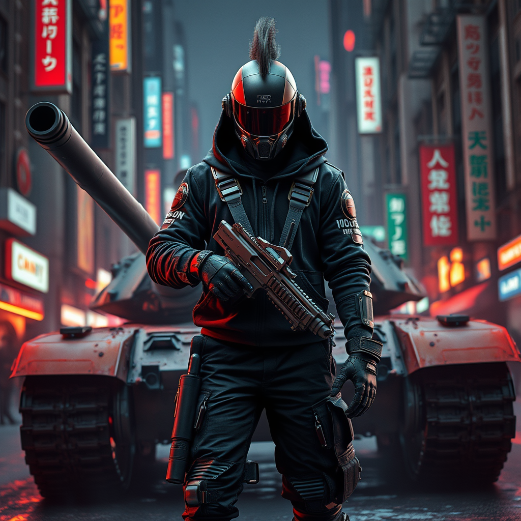 Masterpiece, full-body shot, intricate raw photography. Futuristic cyberpunk, ultra-realistic, highly detailed 3D rendering, top quality, ultra-high-resolution. Cowboy-themed imagery, photorealistic, complex background, surreal, atmospheric, menacing tank, dynamic perspective, high-tech cyber helmet, mecha, robotic armor, mechanical limbs, exo-suit, sci-fi, no human figures, wear asymmetric clothing. Oversized tactical black hoodie, advanced black headgear, HUD display, modern hyper-realistic style, Daft Punk-esque cyber helmet, black tactical gloves, black techwear cargo pants, futuristic attire, mohawk, anarchist, punk-rock vibe, cinematic, sci-fi setting, synthwave, nocturnal, shadowy, complex, futuristic, sharp focus, assertive stance, hi-tech arsenal, vibrant palette, serious tone, cyberpunk metropolis, neon-lit streets, photogenic, Award-winning Photo, cinema4d, dramatic contrast, lights and shadows play, realistic visual effects, top-tier photo-realistic Octane render, highest-quality image.