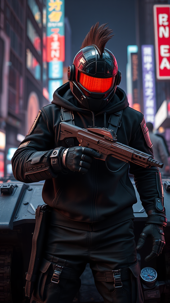 Masterpiece full-body shot, intricate raw photography, cyberpunk, realistic, highly detailed 3D rendering, top quality, masterpiece, ultra-high-resolution. Cowboy-themed photorealistic image, raw photo, official art, close-up, complex background, surreal, atmospheric, sinister, tank, dynamic angle, futuristic cyber helmet, mecha, robot, armor, mechanical arms, exo-suit, science fiction, no humans, worn asymmetric clothing. Tactical oversized black hoodie, advanced black helmet, digital HUD, modern ultra-realistic style, Daft Punk-inspired cyber helmet, black tactical gloves, black techwear cargo pants, futuristic attire, mohawk, punk, rebel, punk-rock, cinematic, sci-fi scene, synthwave, night, dark, intricate, futuristic, sharp, precise focus, aggressive pose, high-tech weaponry, vibrant colors, serious tone, neon-lit cyberpunk cityscape, street neon lights, Insta-worthy photo, Photo of the Year contender, cinema4d, dramatic atmosphere, lights and shadows, realistic visual effects, realistic Octane render, highest-quality photorealistic capture.
