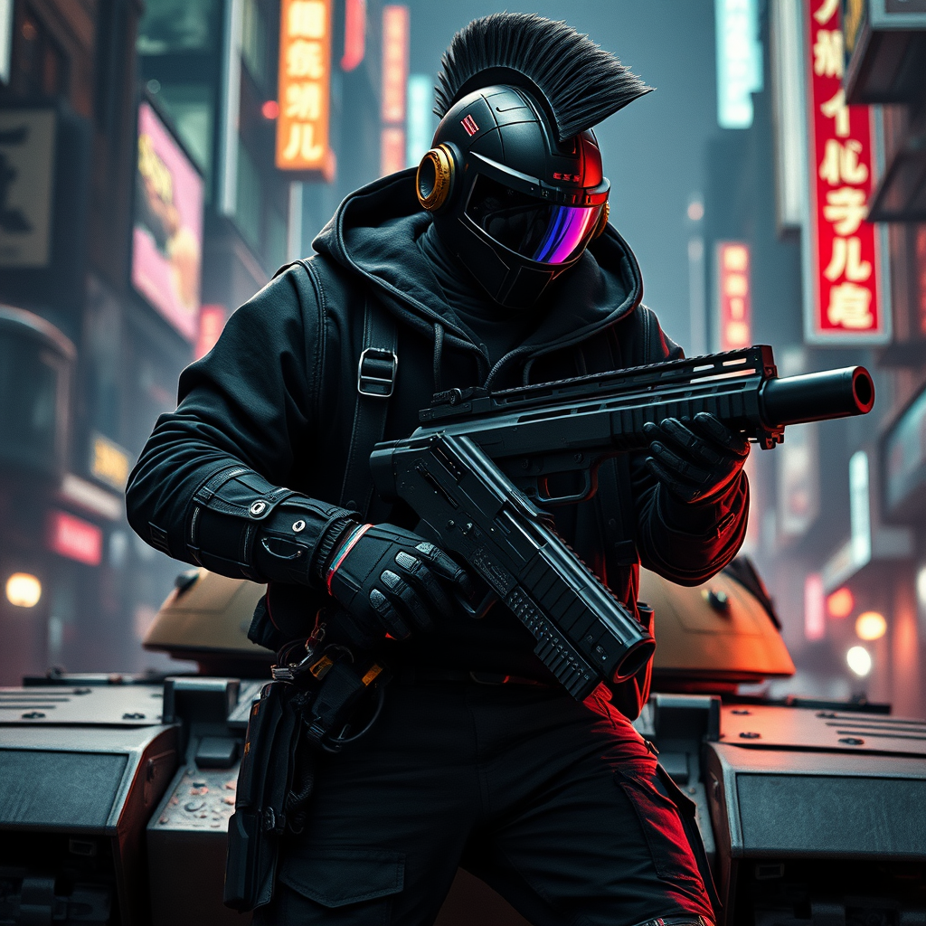 Masterpiece, full-body shot, intricate raw photography. Cyberpunk, realistic, highly detailed 3D rendering, top quality, masterpiece, ultra-high-resolution. Futuristic cowboy-inspired photo, photorealistic, raw photo, official art, close-up, complex background, surreal, atmospheric, enigmatic, tank, dynamic angle, advanced cyber helmet, mecha, robot, armor, mechanical arms, exo-suit, science fiction, devoid of humans, worn asymmetrical attire. Tactical oversized black hoodie, cutting-edge black helmet, HUD, modern ultra-realistic style, Daft Punk-inspired cyber helmet, black tactical gloves, sleek techwear cargo pants, avant-garde clothing, stylized mohawk, punk, renegade, punk-rock, cinematic, sci-fi scene, synthwave, nighttime, dark, intricate, futuristic, sharp, precise focus, aggressive pose, high-tech weaponry, vibrant hues, intense, cyberpunk metropolis, street neon lights, Instagram-worthy capture, Photo of the Year, cinema4d, dramatic, interplay of lights and shadows, lifelike visual effects, realistic Octane render, supreme photorealistic image.