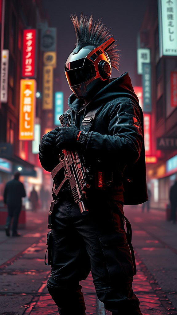 Masterpiece full-body shot intricate raw photography cyberpunk realistic highly detailed 3D rendering apex-quality ultra-high-resolution cowboy-themed piece photorealistic raw photo official art complex surreal background atmospheric and sinister with dynamic tank perspective advanced cyber helmet mecha robot armor mechanical arms exo-suit science fiction devoid of humans worn asymmetric clothing tactical oversized black hoodie advanced helmet with HUD contemporary ultra-realistic Daft Punk-inspired cyber helmet black tactical gloves sleek techwear cargo pants avant-garde clothing mohawk punk rebellious punk-rock cinematic sci-fi scene synthwave nocturnal setting dark and intricate sharp precise focus in aggressive stance high-tech weaponry vibrant color palette serious demeanor cyberpunk metropolis neon-lit streets Insta-worthy capture contender for Photo of the Year cinema4d executing dramatic play of lights and shadows infused with realistic visual effects and highest-quality photorealistic Octane render.