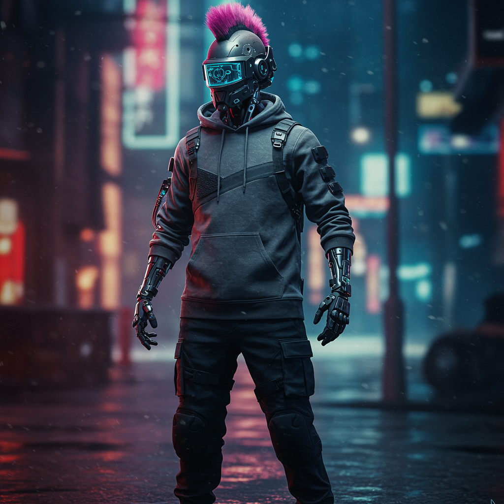 Masterpiece full-body shot, intricate raw photography. Cyberpunk, hyper-realistic, highly detailed 3D rendering, top-tier quality, masterpiece, ultra-high-resolution. Sci-fi cowboy motif, photorealistic, raw capture, official art, close-up, complex backdrop, surreal, atmospheric, foreboding, tank presence, dynamic perspective, advanced cyber helmet, mecha, robotic armor, mechanical arms, exo-suit, speculative fiction, devoid of humans, distressed asymmetric apparel. Tactical oversized charcoal hoodie, advanced ebony helmet with HUD, modern ultra-realistic aesthetic, Daft Punk-inspired cyber headgear, sable tactical gloves, black techwear cargo trousers, futuristic attire, mohawk, punk, dissenter, punk-rock vibe, cinematic, sci-fi tableau, synthwave hues, nocturnal, shadowy, intricate, forward-looking, sharp, precise imagery, aggressive stance, high-tech arms, vivid palette, serious demeanor, cyberpunk metropolis, street neon glows, Insta-ready snapshot, Photo of the Year, cinema4d, dramatic, interplay of light and shadow, genuine visual effects, realistic Octane render, exceedingly high-grade photorealistic visual.