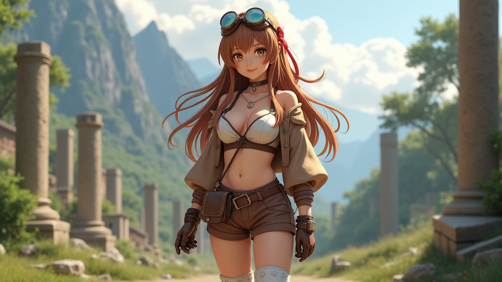 masterpiece, high quality, gentle lighting, high resolution, facing viewer, single subject, smiling, goggles perched on head, amber eyes, chestnut brown hair, long flowing hair, red ribbon in hair, brown shorts, leather gloves, small pouch, thigh-high stockings, white boots, medium bust, cleavage cutout, shrug jacket, standing on one leg, amidst lush ruins, mountains in background, 8k resolution, ultra HD, high dynamic range, unique, natural proportions, focused gaze, elegant posture, detailed hands, sharp focus, seamless integration, clear and vivid, no distortions, clean and crisp image