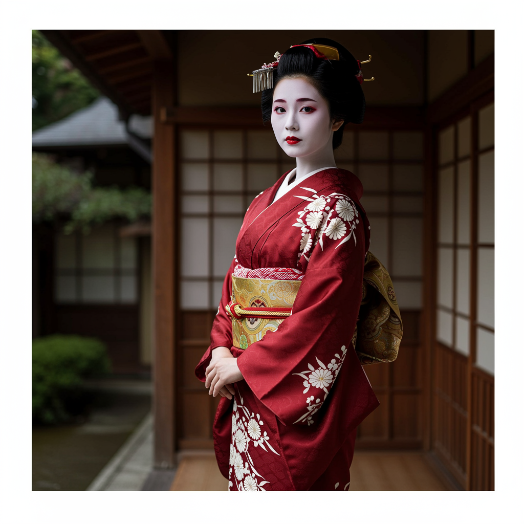 Masterpiece, high-definition, captivating, elegant kimono, deep red hue, intricate white floral motifs, luxurious silk fabric with a glossy finish, striking red obi featuring delicate white flowers intertwined with a golden cord, woman adorned in the kimono, traditional geisha hairstyle, authentic Kyoto setting, alluring and confident, richly detailed backdrop, meeting the viewer's gaze, striking a refined pose for a photograph, ample curves, sophisticated beauty.
