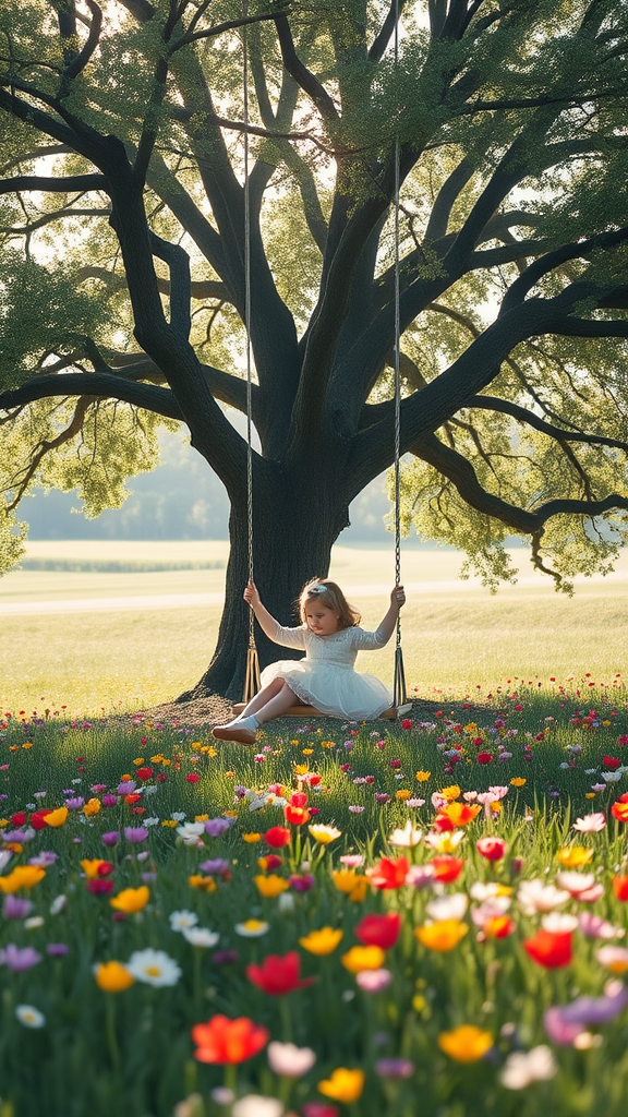 Masterpiece, high-quality image of a girl on a swing beneath a large tree, surrounded by a meadow filled with vibrant, colorful spring flowers. The scene is illuminated by soft, volumetric lighting, creating an enchanting atmosphere. The focus is on the natural beauty and serenity of the landscape, capturing the essence of a peaceful spring day. Despite the initially low resolution, the image has been enhanced to remove artifacts and improve clarity, ensuring a visually appealing composition. Efforts have been made to avoid errors in anatomy and proportion, presenting a harmonious and aesthetically pleasing view without distractions or imperfections.
