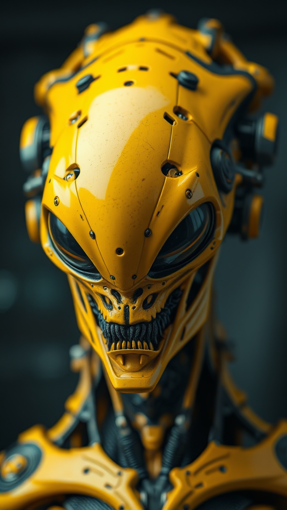 Masterpiece, high quality, intricate yellow and black alien 3D model, evoking surreal cyberpunk iconography, featuring a close-up shot that incorporates elements of steelpunk and dieselpunk, utilizing photobashing techniques. Captured with a Leica R8 camera in stunning 8k, UHD, HDR. Enhanced with rich details and sharp clarity, avoiding issues like blurriness, low resolution, cropping, and unwanted elements such as text, artifacts, signatures, watermarks, usernames, artist names, trademarks, titles, multiple views, reference sheets, and ensuring the subject is entirely in frame.