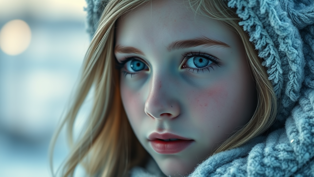 Masterpiece, high-quality portrait of a teenage girl with a serene expression, featuring an icy blue and silver color palette, set against a soft, blurred winter landscape. 8k resolution, UHD, HDR, capturing intricate details and subtle light reflections for a stunning visual experience.