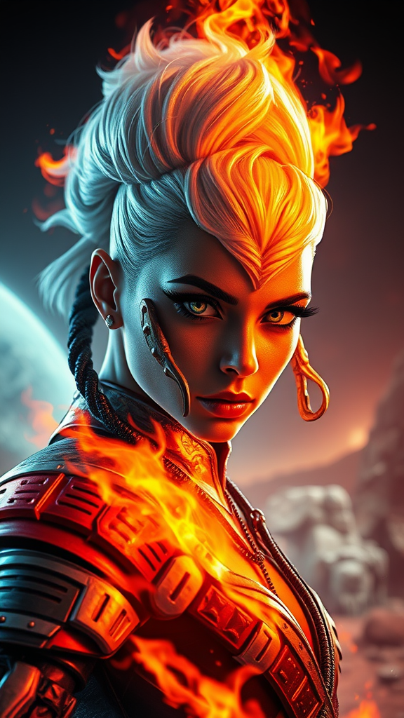 Masterpiece, high quality, realistic, colorful cinematic lighting, photo of a fire warrior with striking white updo hair and captivating eyes, inspired by a Shas Warrior from Warhammer 40k, fanart characterized by vivid details and vibrant colors. Set against a detailed background of an alien planet landscape, the composition includes a dynamic pose and an aggressive expression. It's complex and technologically advanced, with a sci-fi theme captured through a 50mm prime lens at F/2.8 aperture, delivering hyper realistic and lifelike textures in a photorealistic 8k resolution. Sharp focus, enhanced by unreal engine and ENB, cinestill 800 effects. Despite avoiding artistic anomalies such as poorly drawn or incorrect anatomy, this creation maintains its integrity with proper proportions and lifelike articulation.